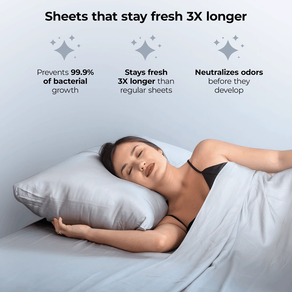 Each Silvery® Bed Sheet set features silver-infused fabric engineered to actively regulate temperature and stay fresh 3X longer, so you sleep cool and comfortable all night long.