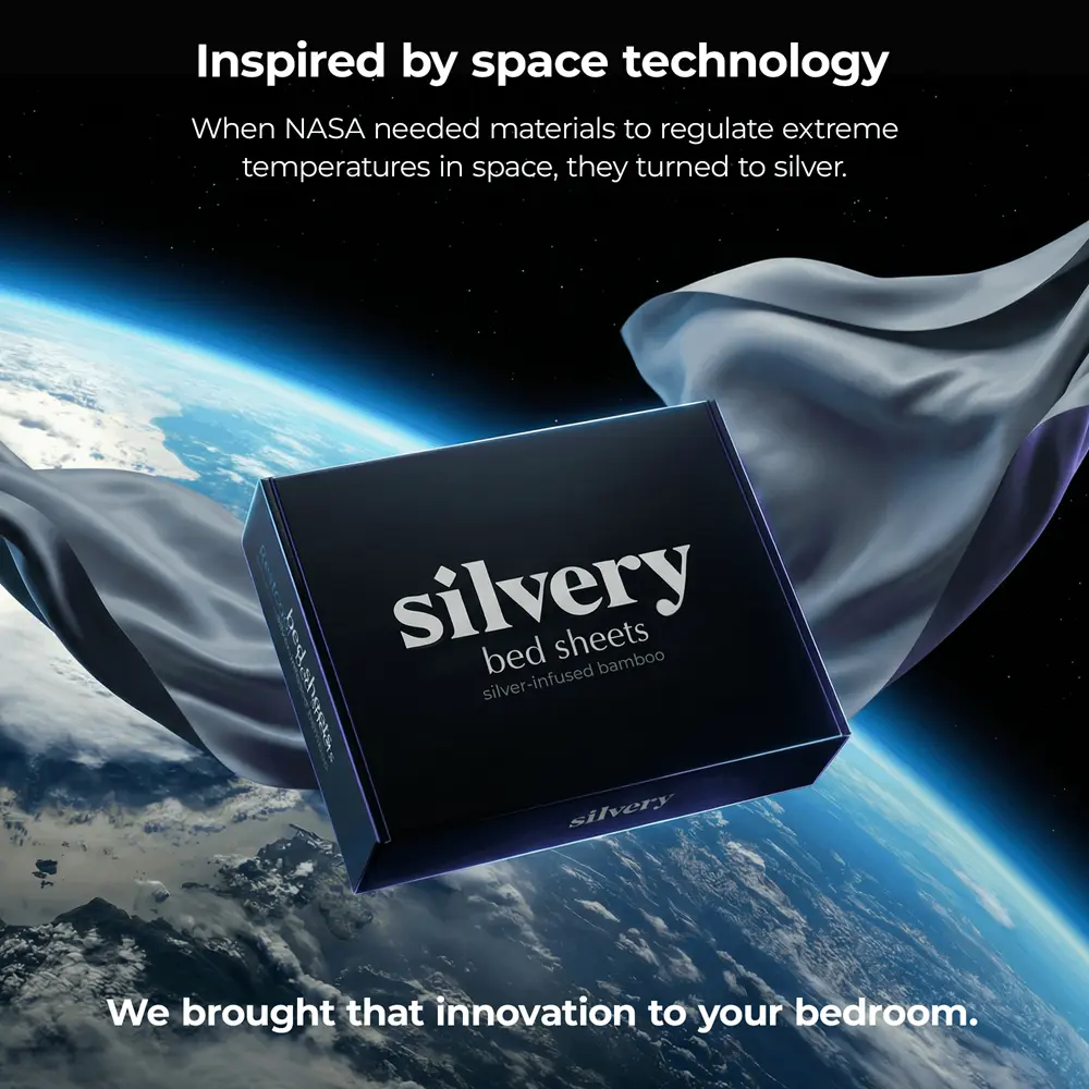 Silvery® Bed Sheets combine NASA-inspired silver technology with premium sateen weave to actively regulate temperature, eliminate 99.9% of bacteria growth, and deliver a cool-to-the-touch surface that gets softer with every wash.