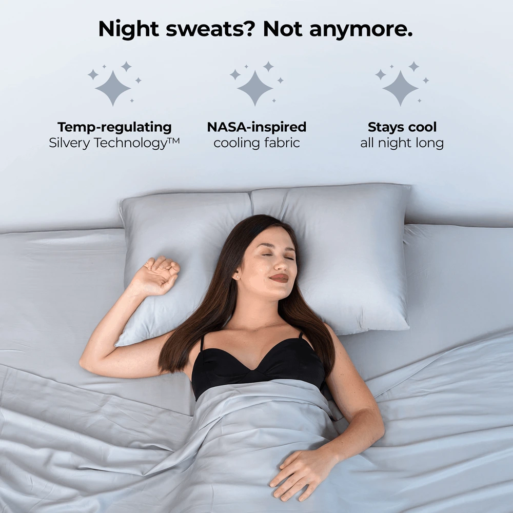Silvery's silver-infused fabric helps regulate temperature throughout the night. The result: you stay cool, dry, and comfortable without constant tossing and turning. No more flipping your pillow to find the "cool side."