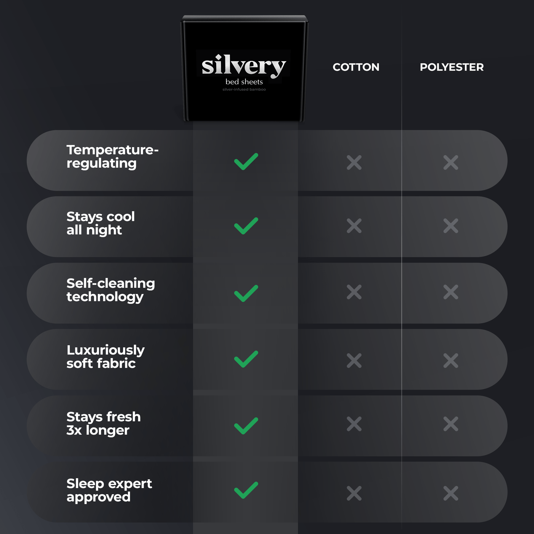 Each Silvery sheet is made with silver-infused fabric that actively regulates body heat and stays fresh longer—so you stay cool, dry, and comfortable all night long.