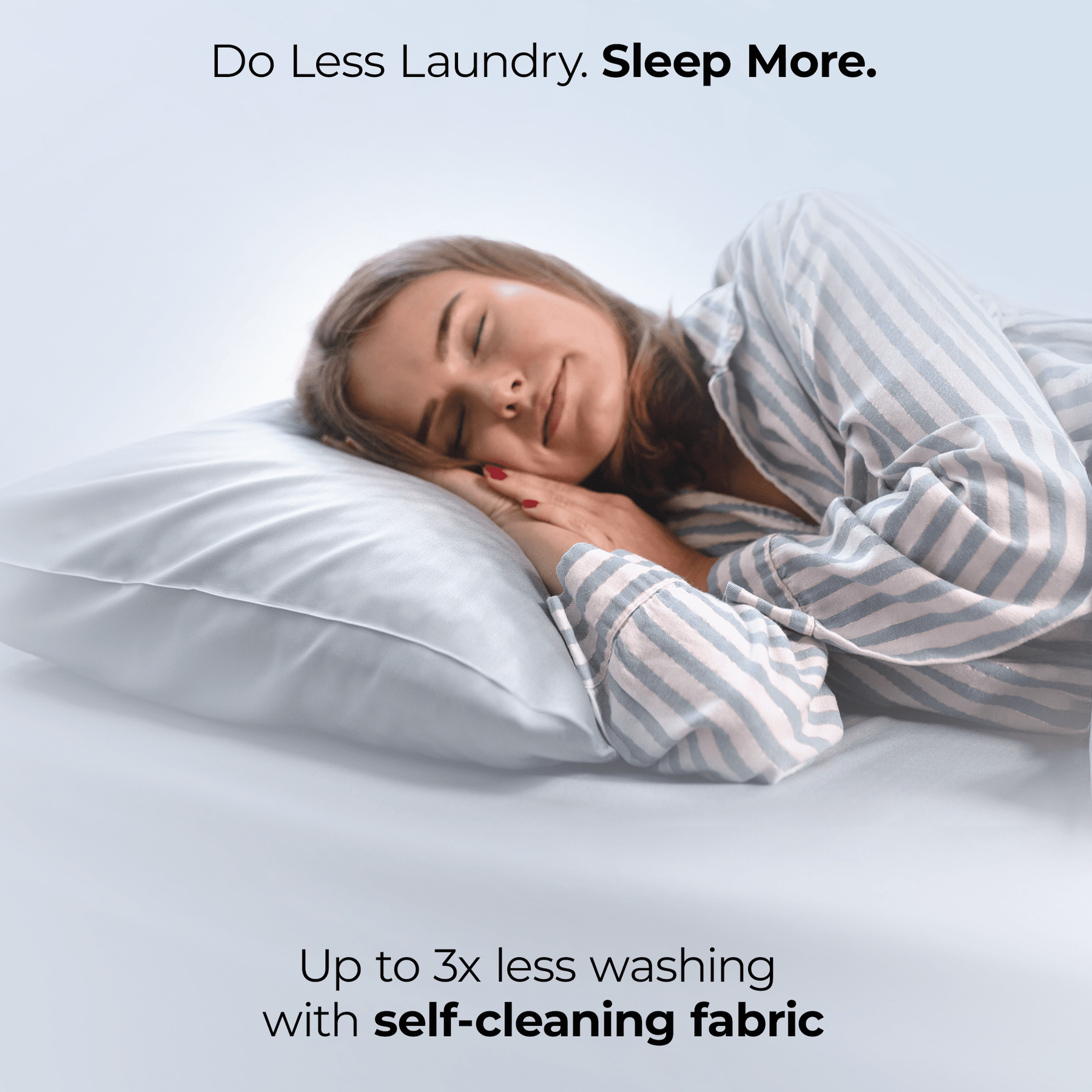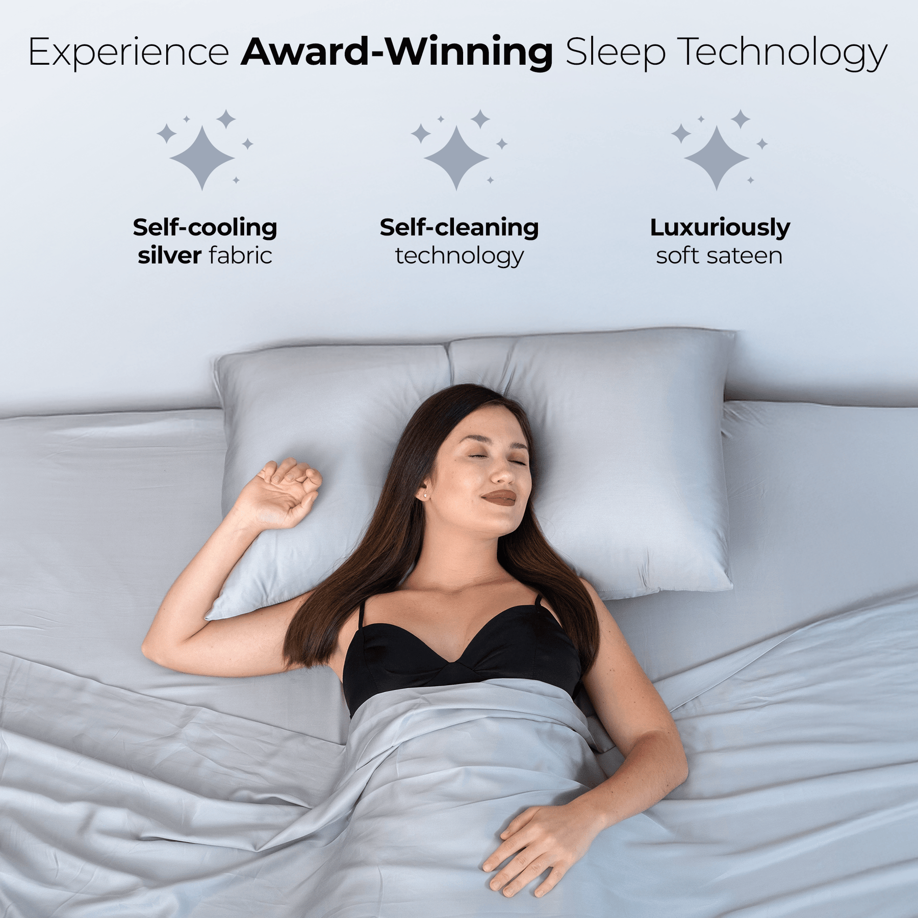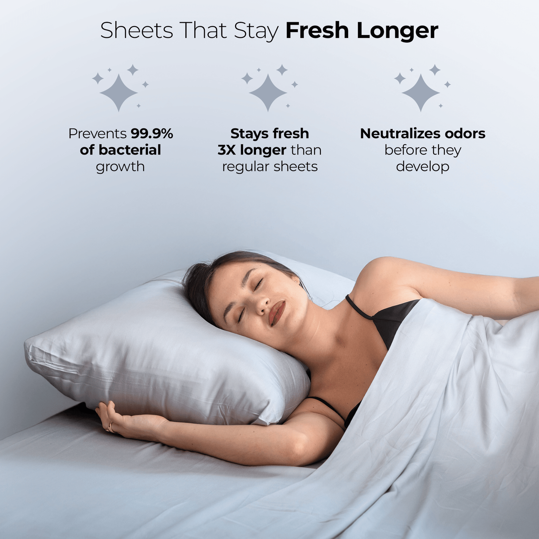 Silvery silver-infused sheets are lab-tested to prevent 99.9% of bacteria, keeping your bedding fresh longer and reducing the need for frequent washing by up to 3X.